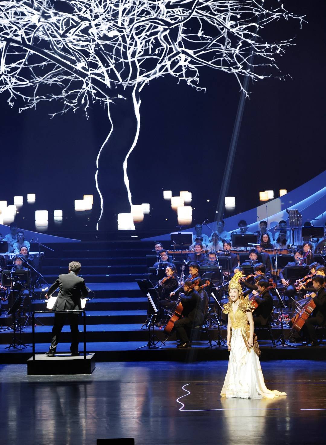 本次演出的舞台视觉是一大看点。导演团队运用多重冰屏与先进舞美技术相结合,营造出流光溢彩的“金沙”视觉效果。例如在第四幕《花间》唱段中,投影技术构建出精致的亭台楼阁,花蕊夫人在虚拟与现实交织的美景中吟唱。